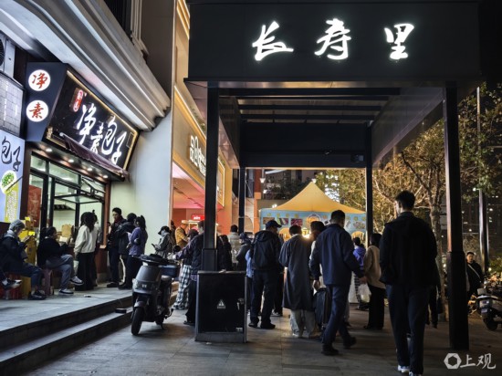 今年初刚开业的长寿里,“三条队伍”最有名。最东边净素包子铺是“国民级”网红,凭借稳定的品质与亲民的价格积累了大量忠实客群,不分早晚要排队,最高峰排队时长达30分钟;当中是其核心商户——一家西北菜餐厅,一楼、二楼共4000平方米的营业面积,沿街窗口的羊肉串、新疆馕香气扑鼻,又是一列长队;最西边则是以好吃著称的糖炒栗子……如此,甜、咸、荤、素齐备,路人走过总忍不住去那缭绕香气里“轧轧闹猛”。